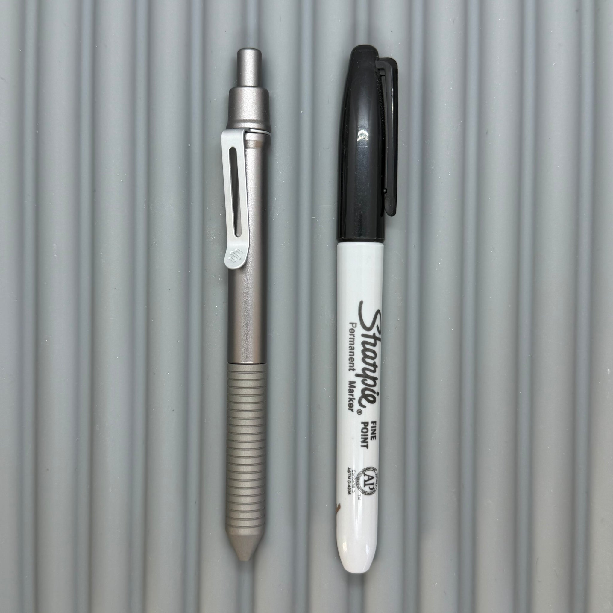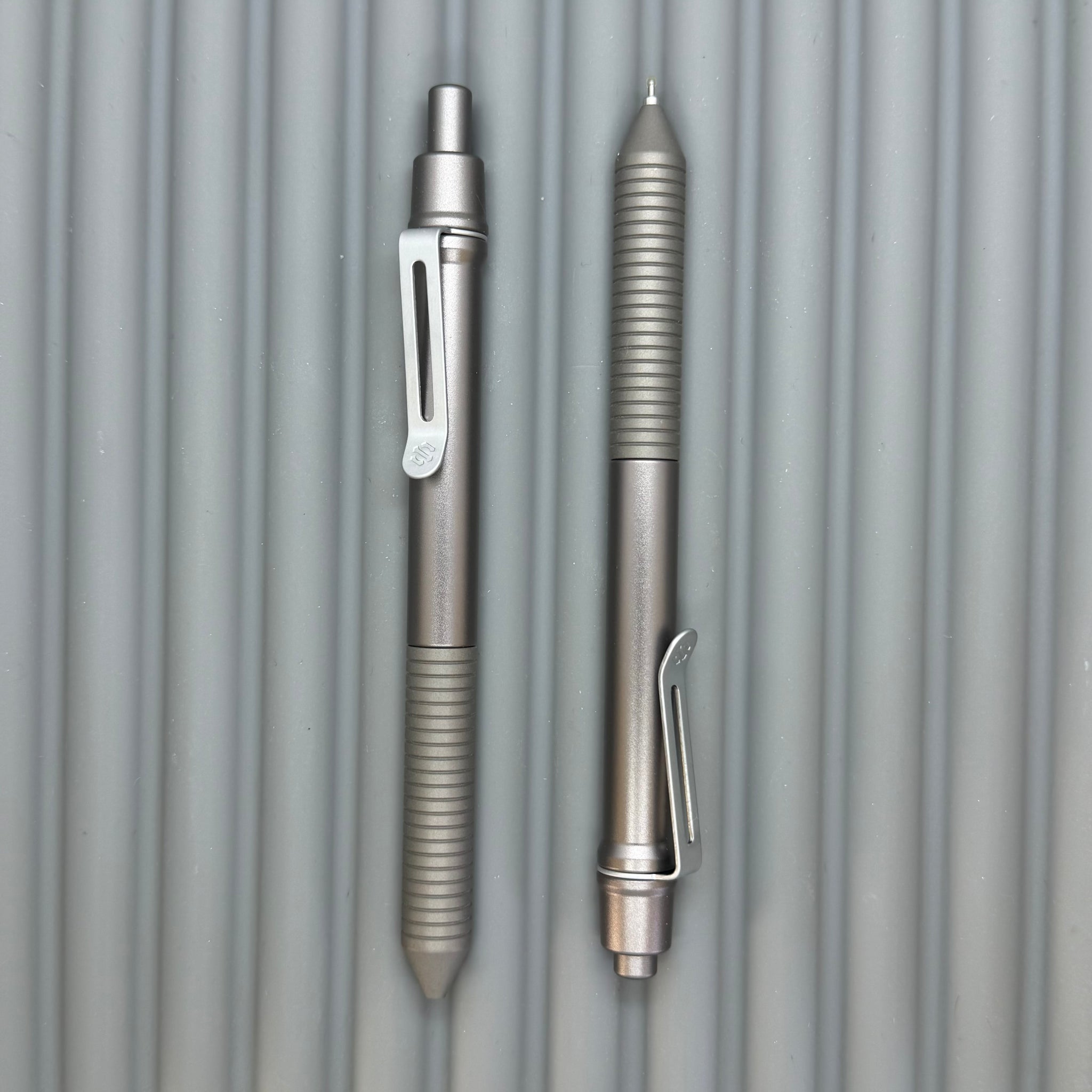 If all Aluminum feels too light, and all Titanium feels a bit heavy... these Aluminum/Titanium mixes might be just for you! Our gunmetal Anodize matches up well with sandblasted Titanium for a uniform metallic look. The diamond PEAK KNURLED grip provides aggressive grippy-ness. These pens include our frost silver low profile spring steel clip.