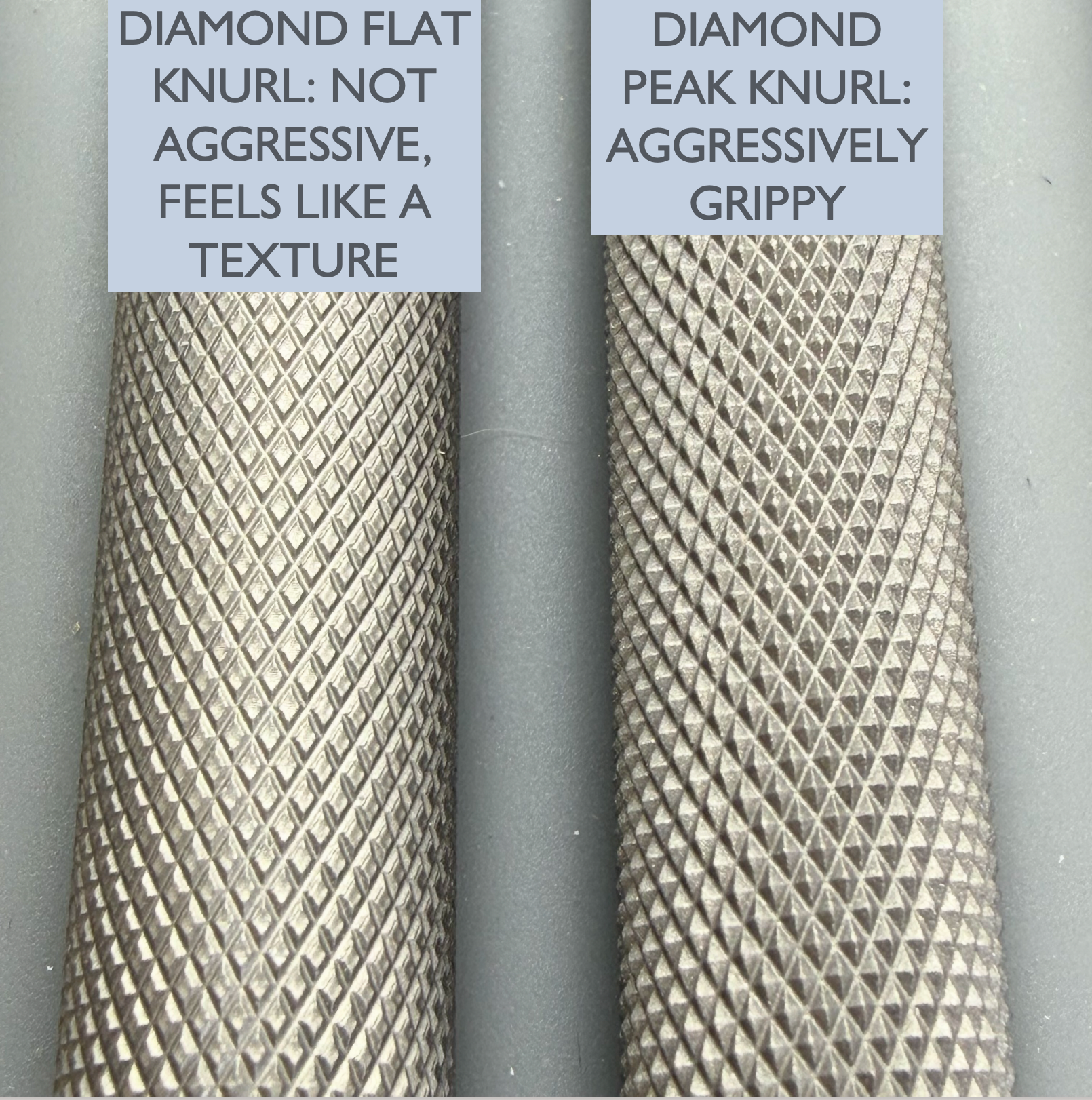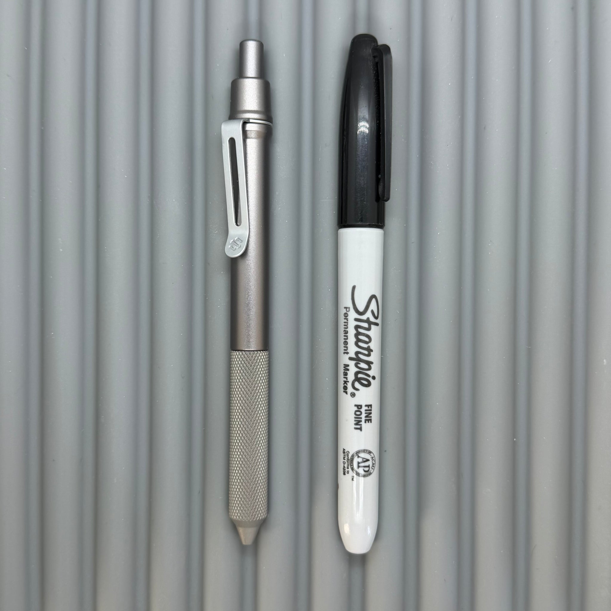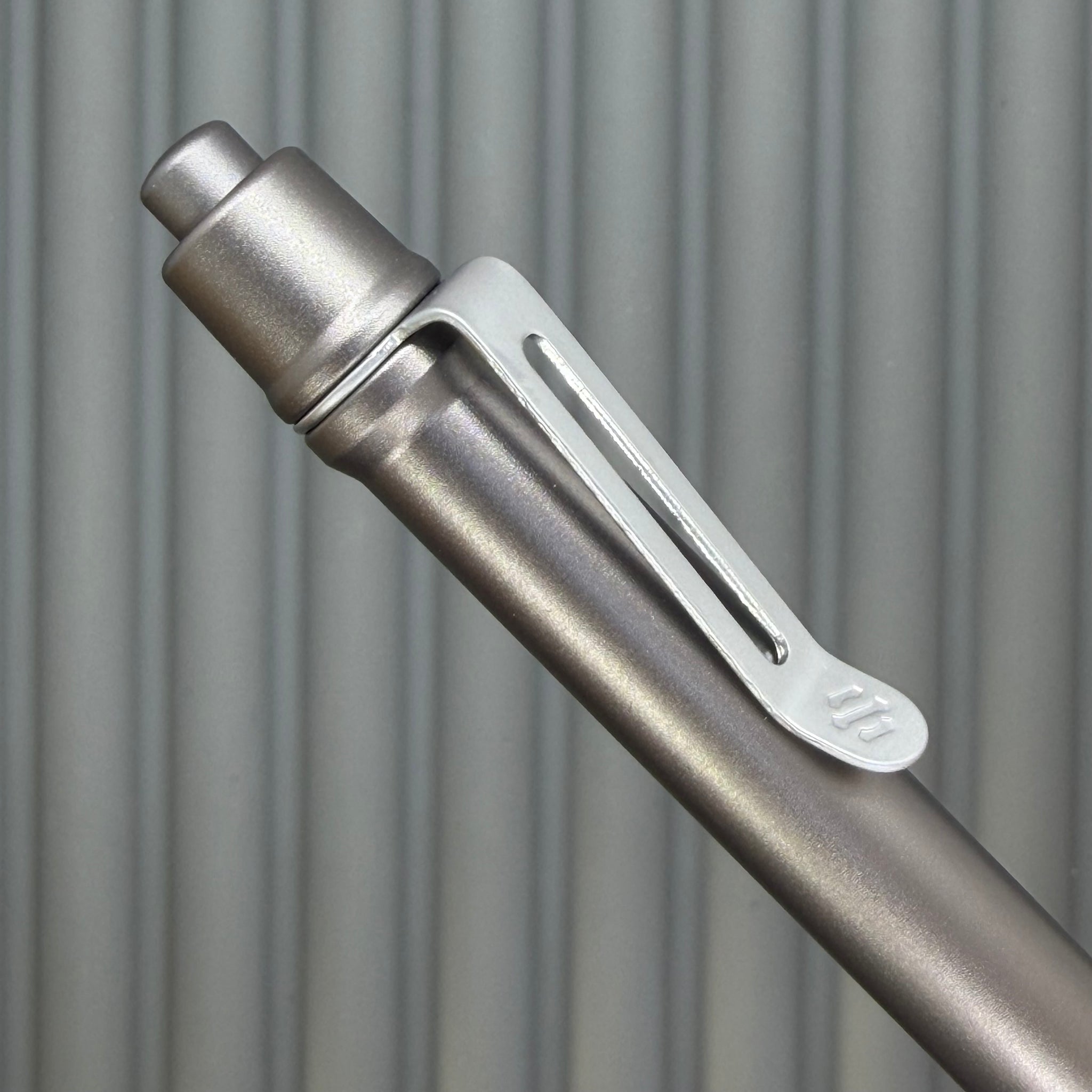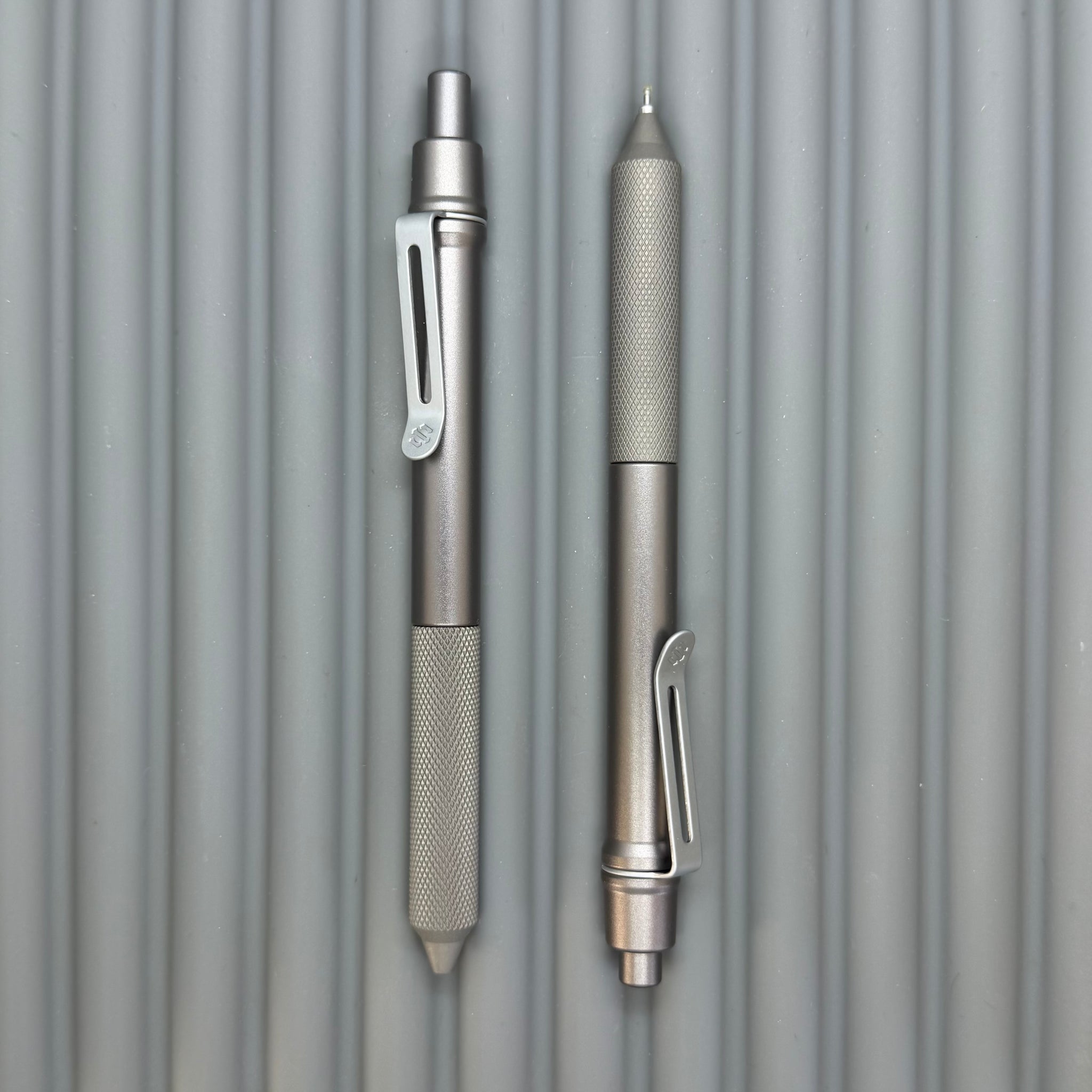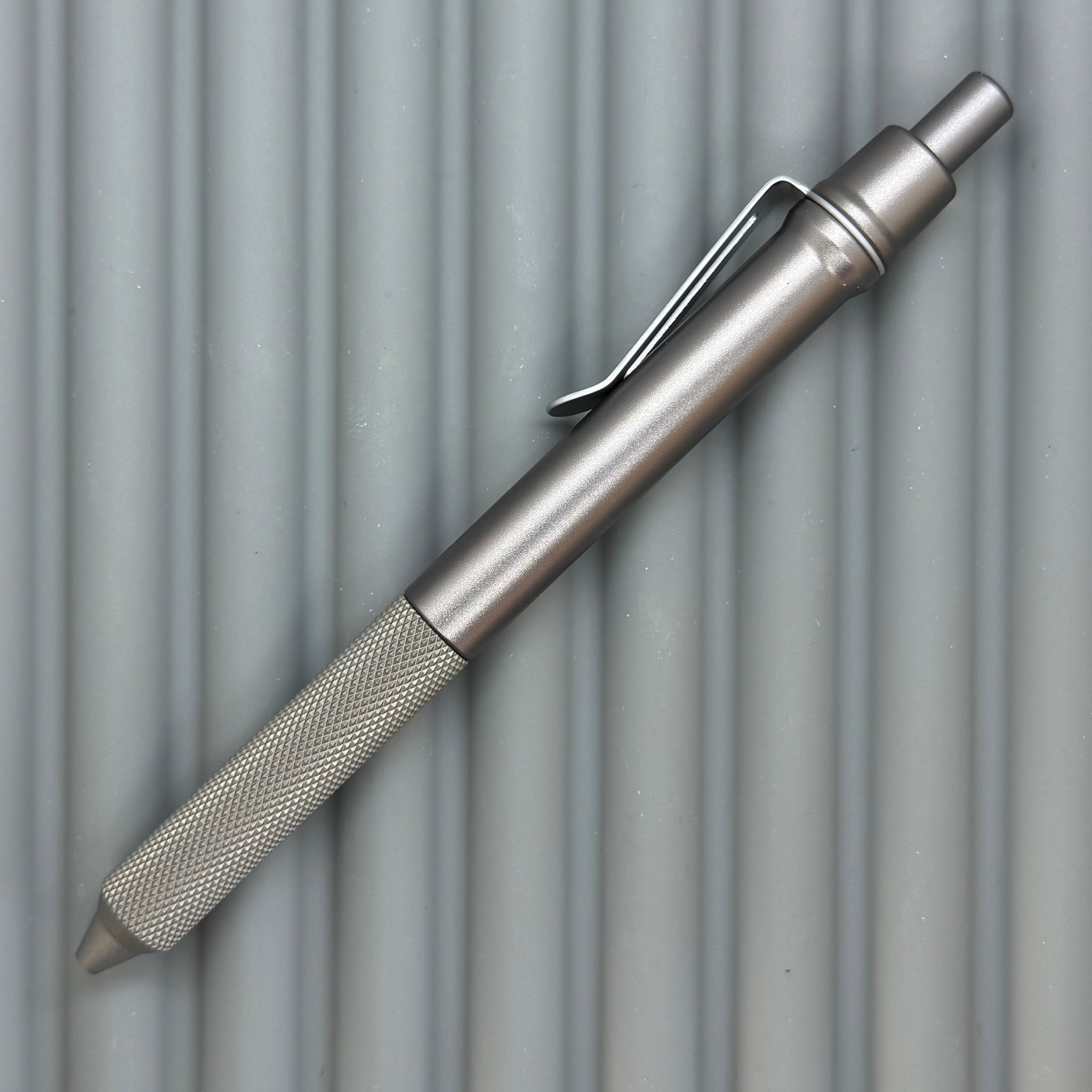 If all Aluminum feels too light, and all Titanium feels a bit heavy... these Aluminum/Titanium mixes might be just for you! Our gunmetal Anodize matches up well with sandblasted Titanium for a uniform metallic look. The diamond FLAT KNURLED grip provides nice textured grippy-ness without being harsh. These pens include our frost silver low profile spring steel clip.