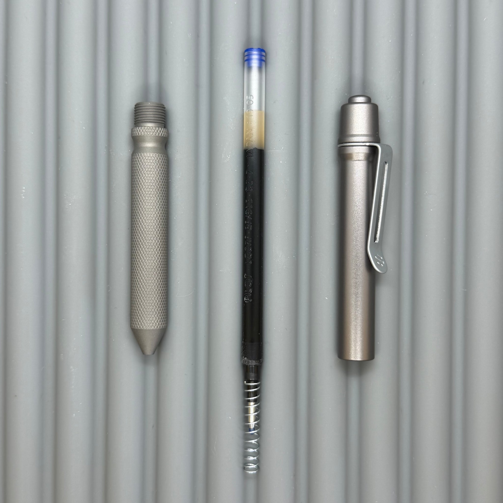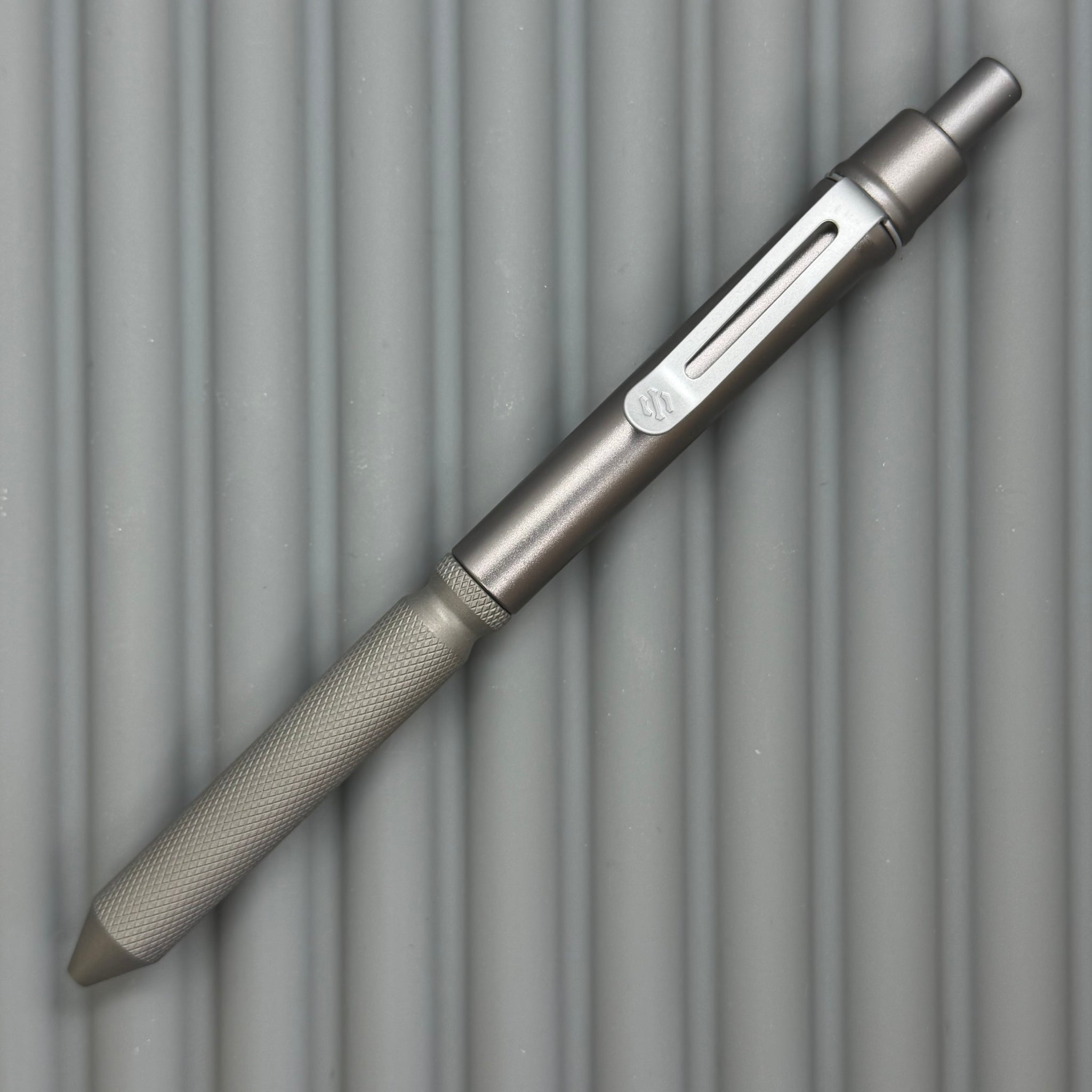 If all Aluminum feels too light, and all Titanium feels a bit heavy... these Aluminum/Titanium mixes might be just for you! Our gunmetal Anodize matches up well with sandblasted Titanium for a uniform metallic look. The diamond FLAT KNURLED grip provides nice textured grippy-ness without being harsh. These pens include our frost silver low profile spring steel clip.